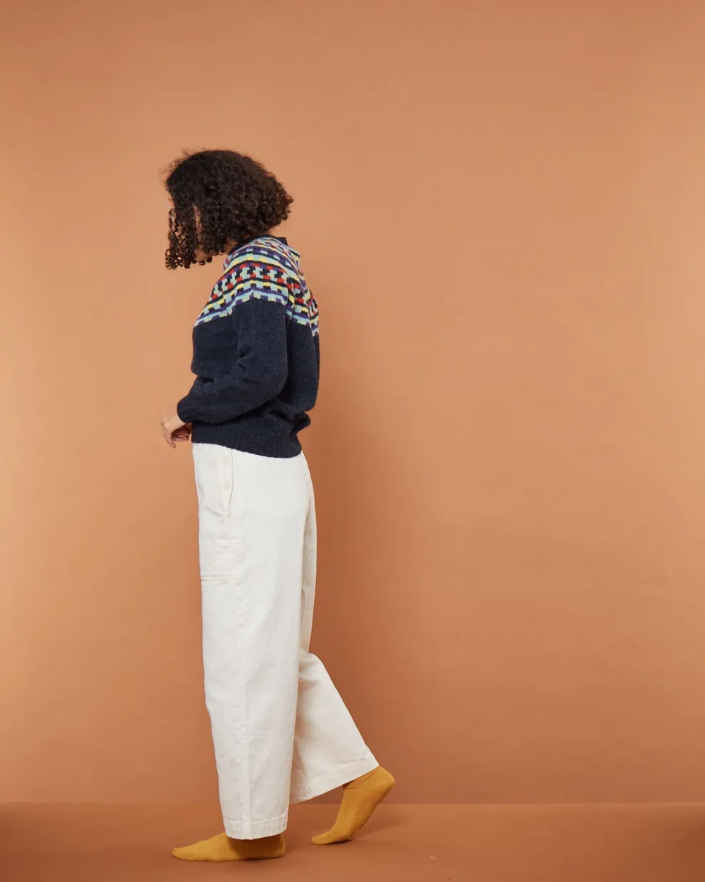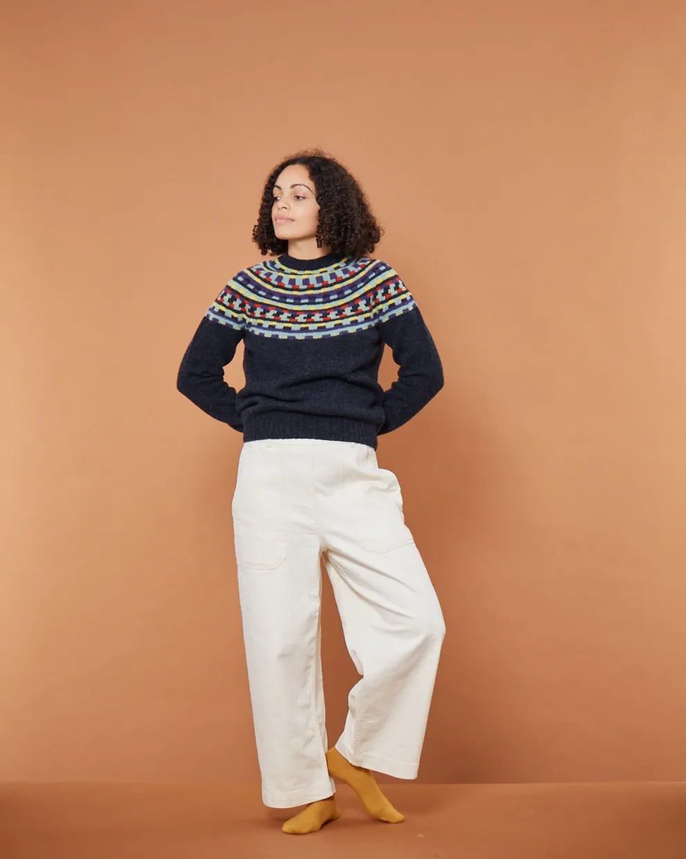 Our yoke sweaters are knitted in the round in Scotland, which means there are no side seams, and creates less wastage.