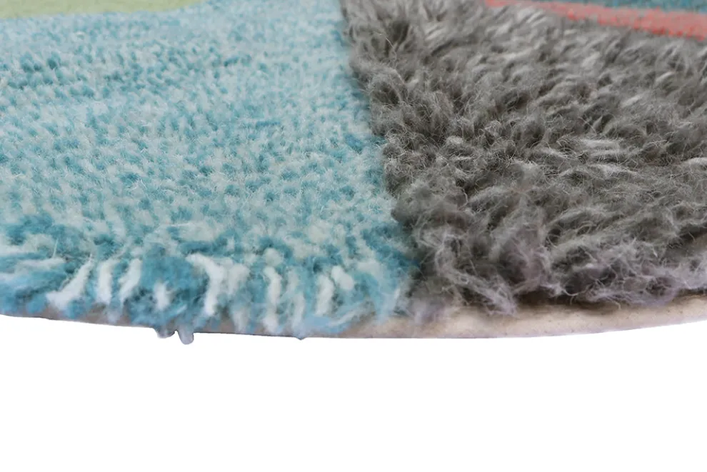 The Pie Chart Rug has a short pile, with a contrasting segment in a longer wool pile, adding texture.